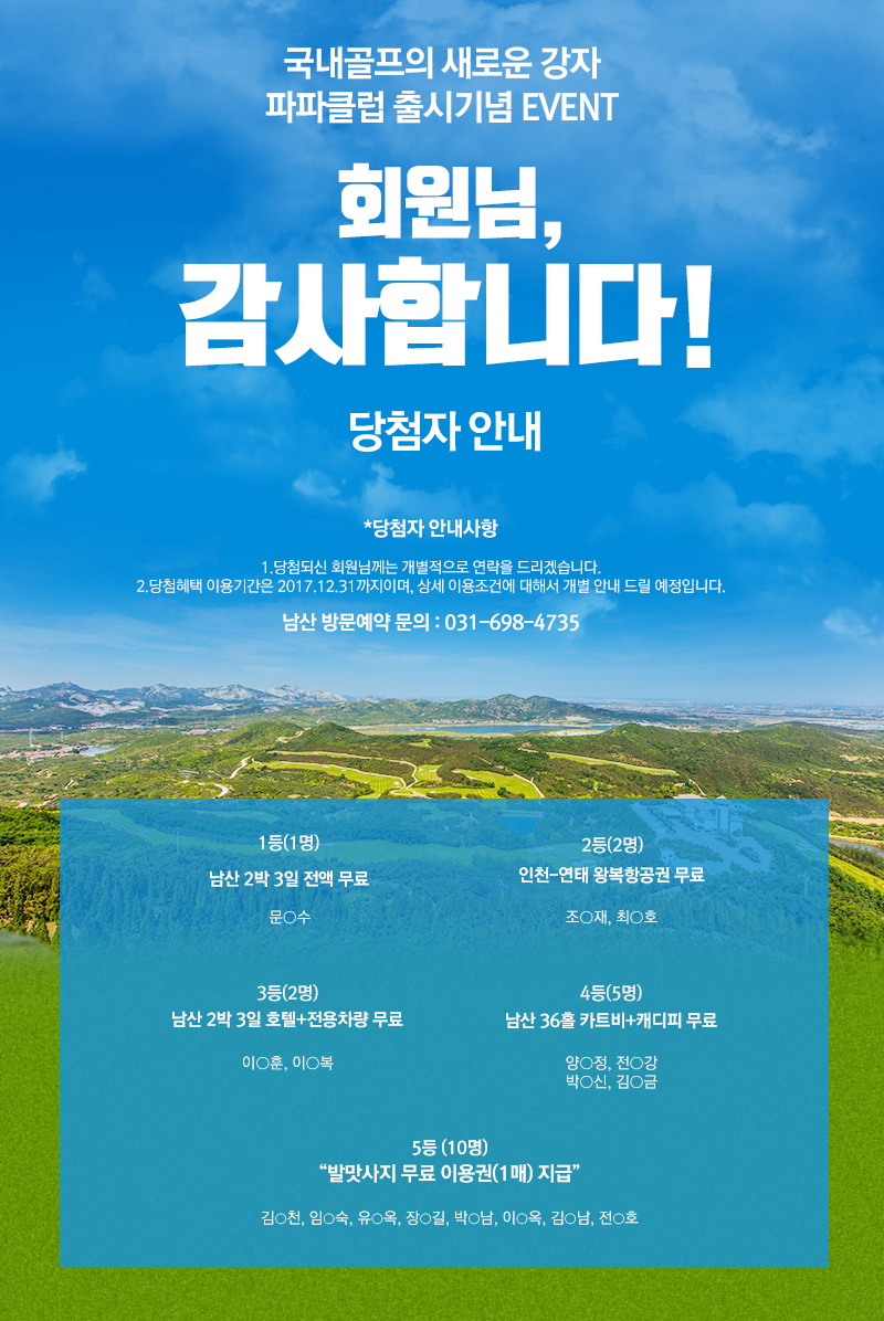 | 2 | ȸ¿ø´Ô, °¨»çÇÕ´Ï´Ù! ´ç÷ÀÚ ¹ßÇ¥ | 2017.10.19 | 1,420 |